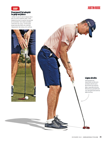 J’utilise le grip en pince depuis deux ans et ça m’a vraiment aidé. Cette manière de tenir le putter me permet de neutraliser mes mains pendant l’exécution du coup. Il m’est ainsi beaucoup plus facile de contrôler l’alignement de la face et le rythme.